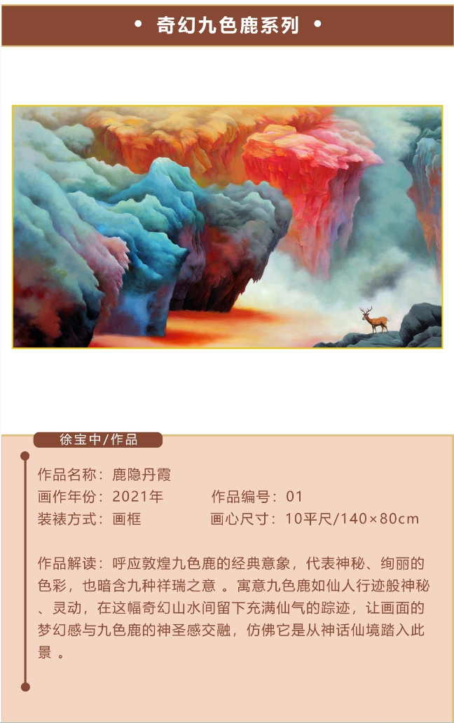作品描述:徐宝中 与徐悲鸿并称“中国美术教育双徐”新中国党属第一艺术学院当代领路人鲁迅美院当代四杰之一鲁迅美术学院绘画艺术学院院长、教授硕士研究生导师中央美术学院国际版画研究院副院长辽宁省美术家协会副主席辽宁省美术家协会版画艺术委员会副主任1963年生(62岁),1985年考入鲁美版画系,1990年毕业并留校任教。先后任鲁美版画系副系主任、主任、绘画艺术学院院长辽宁省“四个一批”人材,辽宁省第八届教学名师,主持完成两项本科教改项目,一项研究生教改项目,完成一项国家艺术基金美术创作项目。作品解读:呼应敦煌九色鹿的经典意象,代表神秘、绚的色彩,也暗含九种祥瑞之意 。寓意九色鹿如仙人行迹般神秘灵动,在这幅奇幻山水间留下充满仙气的踪迹,让画面的梦幻感与九色鹿的神圣感交融,仿佛它是从神话仙境踏入此景
