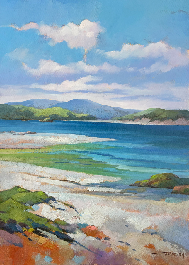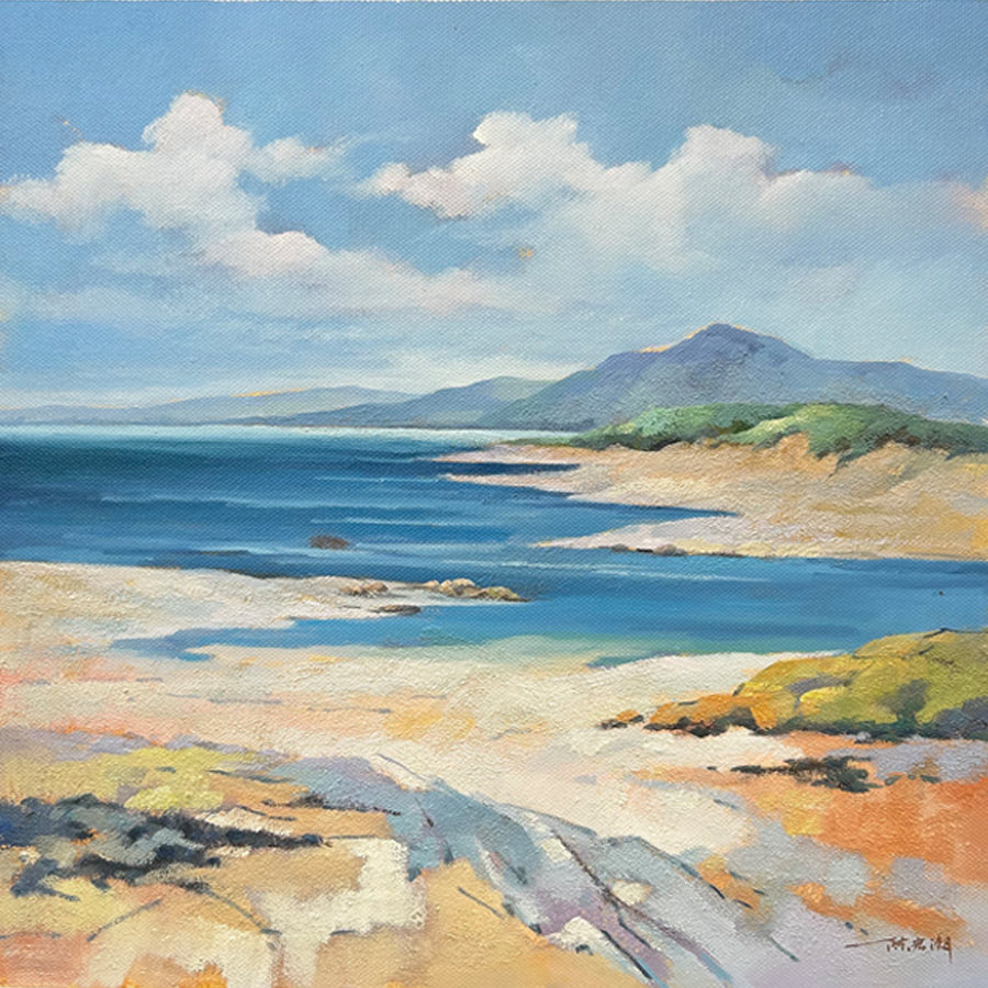 作品描述:作品是一组以 海岸风光 为主题的系列创作。我希望用笔触捕捉海天交接间最纯粹的色彩与宁静,海浪轻拍沙滩,像是一首轻快的小夜曲;远山与碧海相依,潮水与礁石交织,层层色彩让人仿佛能听见大海的呼吸。作品不是单纯的风景描绘,而是对“心灵与大海的对话”的呈现,让观者在画布前就能感受到海风与自由。