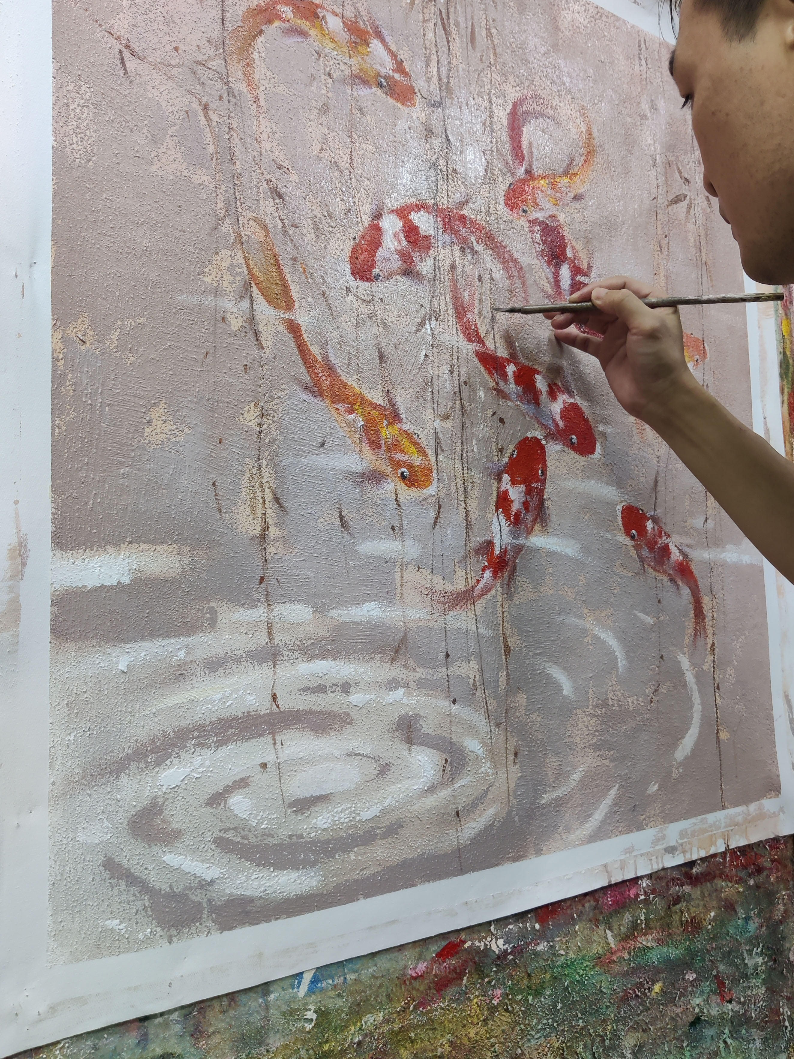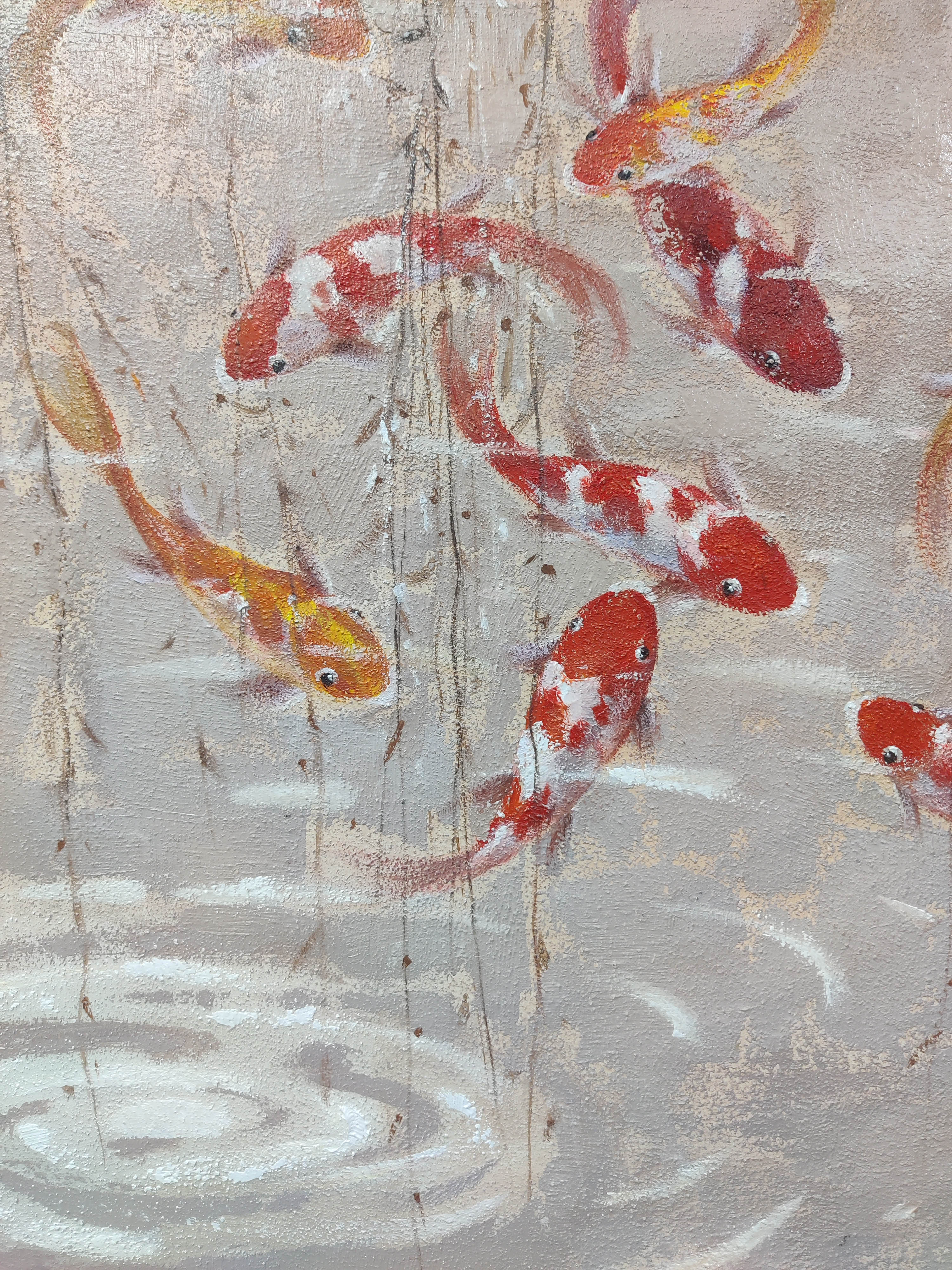 作品描述:画面以西方油画现代艺术表现风格形式结合中国文化元素,画面以九条锦鲤、垂柳、波纹涟漪为内容,绘画步奏及技法以综合材料为媒介:沙子混油画肌理胶为画面底子,以丙烯为主绘画材料表现,表现出灵动游走不一方向的锦鲤,色调以莫兰迪灰为主,寓意和象征长久吉祥、招财旺运、年年有鱼,是传统文化中备受推崇的祥瑞符号