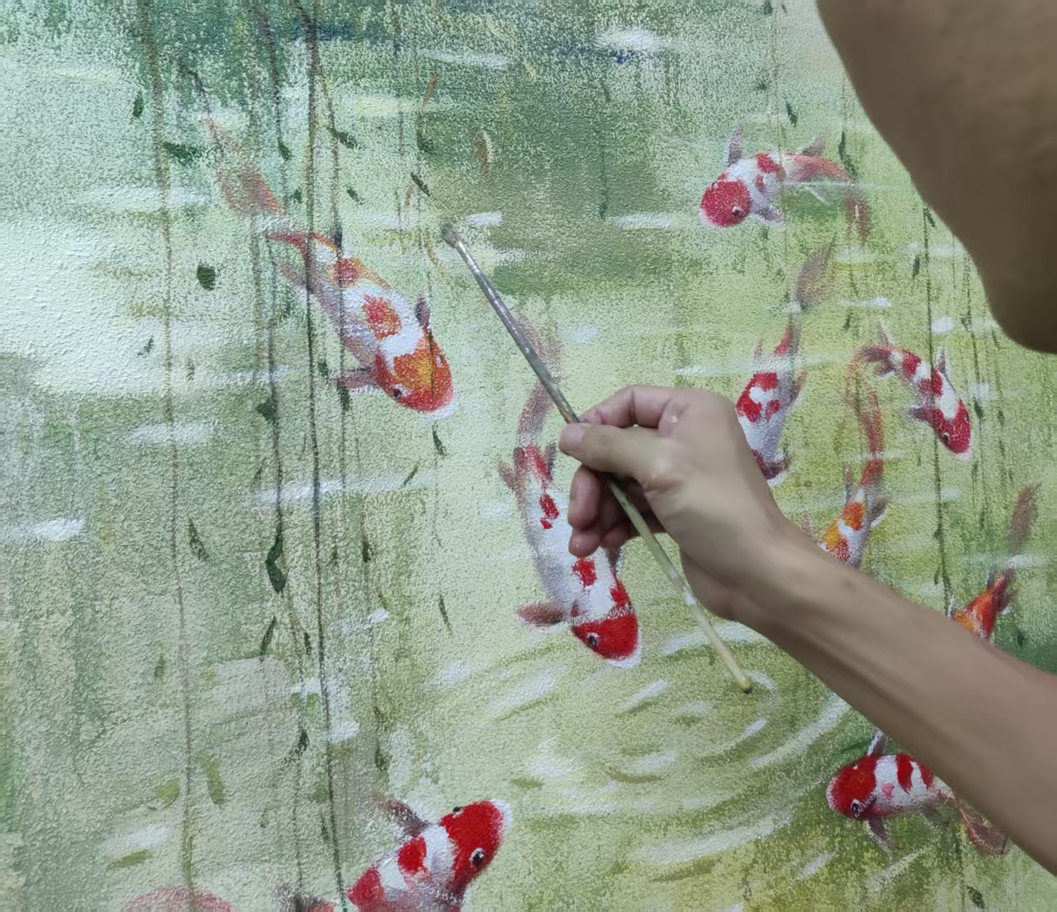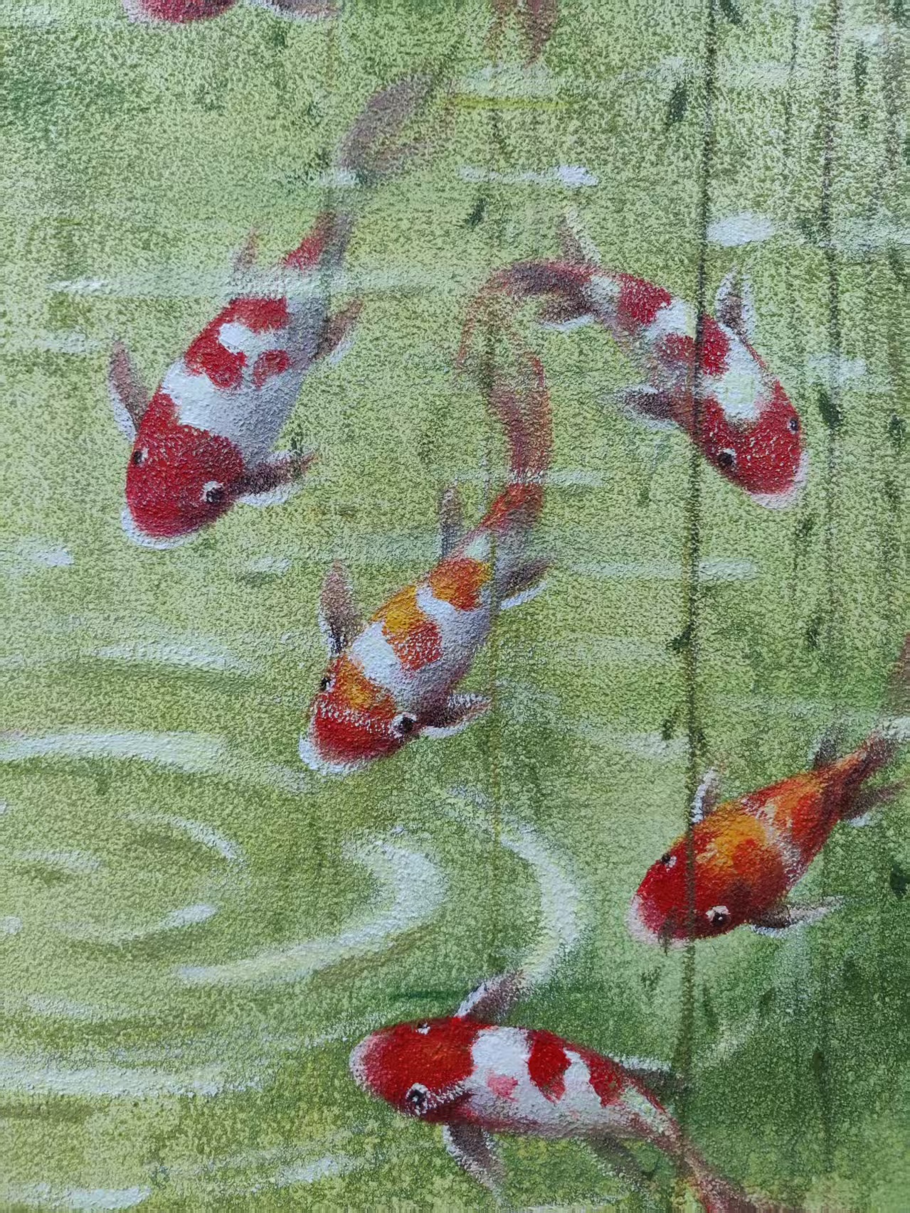 作品描述:画面以西方油画现代艺术表现风格形式结合中国文化元素,画面以九条锦鲤、垂柳、波纹涟漪为内容,绘画步奏及技法以综合材料为媒介:沙子混油画肌理胶为画面底子,以丙烯为主绘画材料表现,表现出灵动游走不一方向的锦鲤,色调以黄绿色为主,寓意和象征长久吉祥、招财旺运、年年有鱼,是传统文化中备受推崇的祥瑞符号