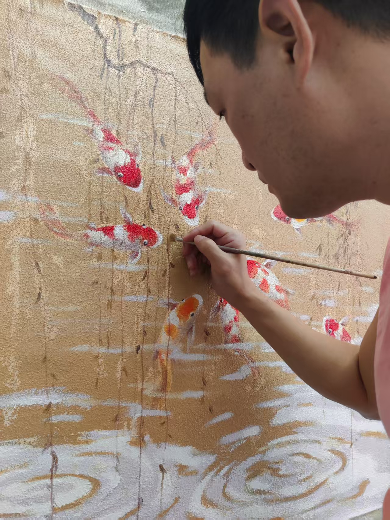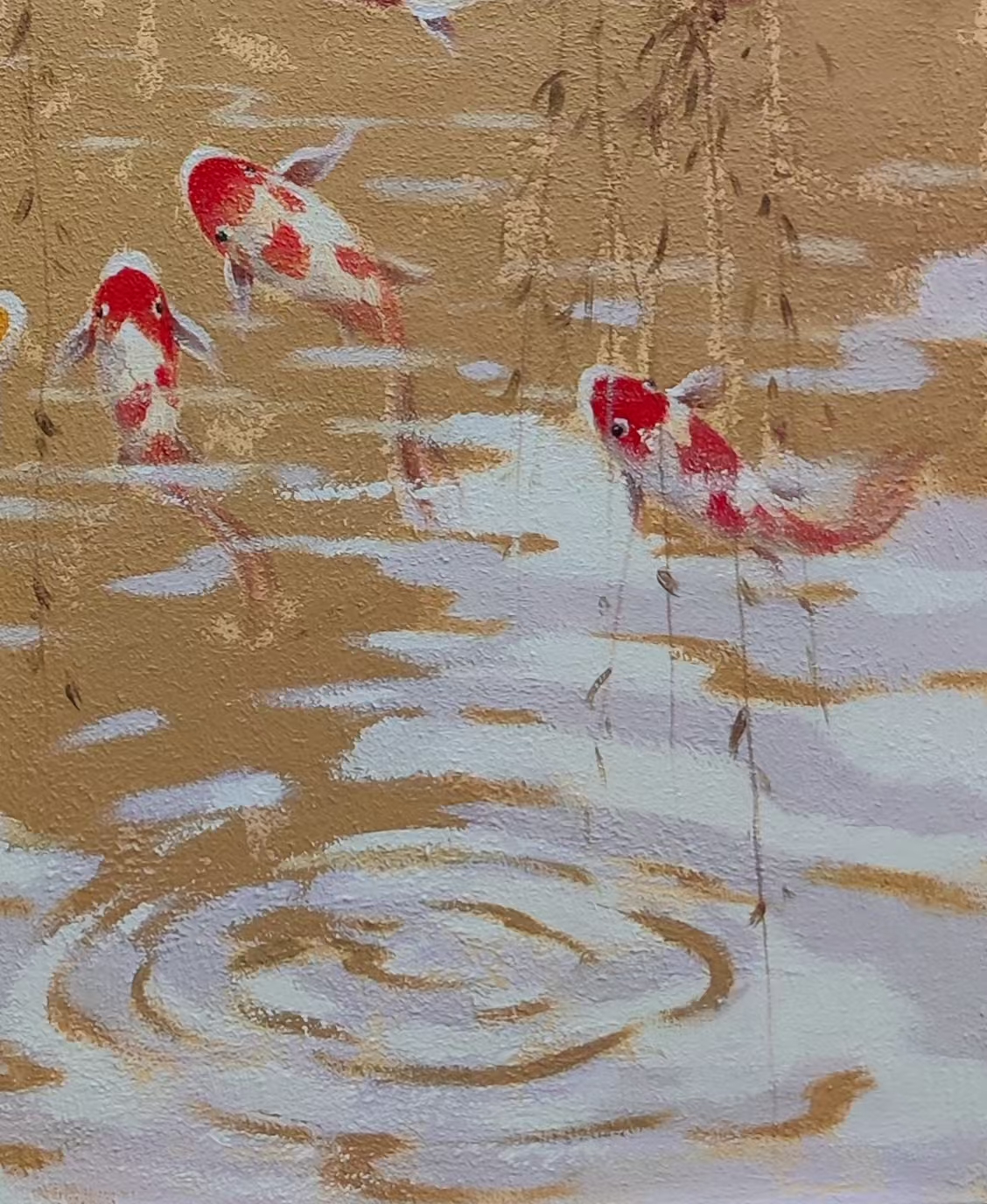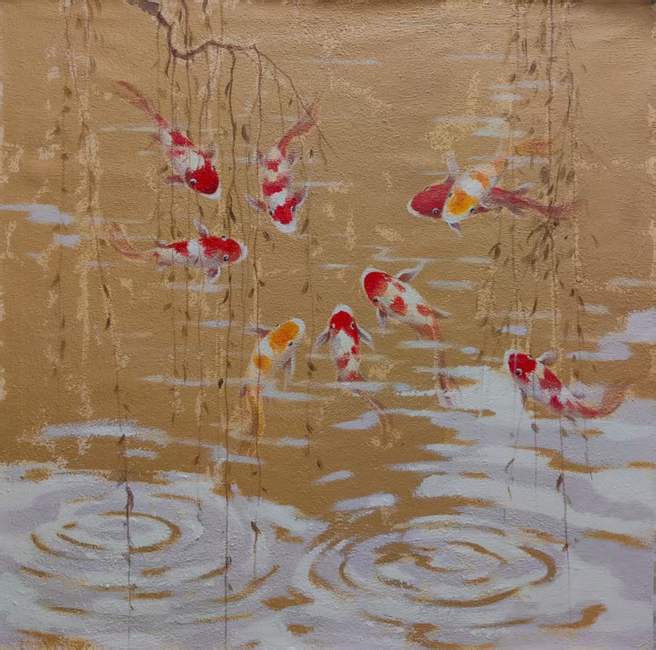 作品描述:画面以西方油画现代艺术表现风格形式结合中国文化元素,画面以九条锦鲤、垂柳、波纹涟漪为内容,绘画步奏及技法以综合材料为媒介:沙子混油画肌理胶为画面底子,以丙烯为主绘画材料表现,表现出灵动游走不一方向的锦鲤,色调以莫兰迪灰+土黄为主基调,寓意和象征长久吉祥、招财旺运、年年有鱼,是传统文化中备受推崇的祥瑞符号